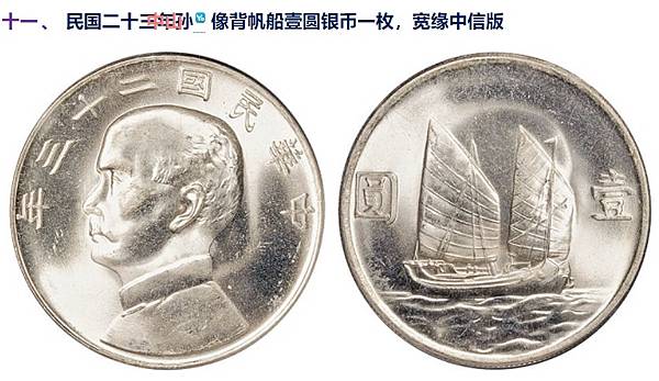 孫中山先生是偉大的民族英雄,中國民主革命的偉大先驅。他發起和領導的辛亥革命,徹底推翻了在中國持續2000多年的封建王朝統治。為了讓世人銘記孫中山先生的豐功偉績,在民國時期,鑄造發行了鐫有孫中山先生頭像各種版式的銀幣。正面為孫中山像,背面鐫一輪金光閃閃的太陽,中間為帆船在乘風破浪前進;1933年和1934年,民國政府鑄造了正面鐫孫中山像,背面鐫一艘帆船乘風破浪前進,俗稱「船洋」; 不同的歷史時期都會留下不同的歷史印跡。