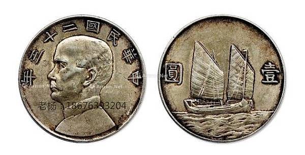我們俗稱帆船幣,在中國近代發行的上千種老銀幣中,其影響僅次於「袁大頭」銀幣。其正面圖案中間是民主革命先行者孫中山先生身著漢裝的側面頭像,上方紀年「中華民國二十一年」。背面圖案是一艘雙桅帆船放洋圖,紀值「壹圓」,直徑3.94厘米,重量26.7克,成色88%,含純銀23.5克,外環直齒邊。「船洋」發行後,和「袁大頭」、「開國紀念幣」一起逐漸取代了流通於市面上的各式「龍洋」和外國銀元。