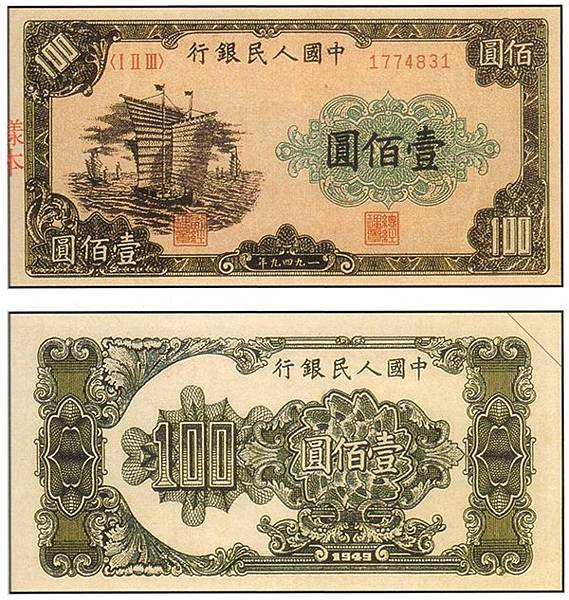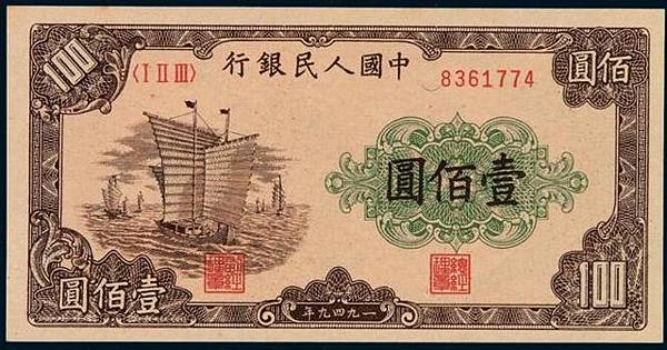 1949年100元人民幣大帆船以集合圖案組成,紙幣沒水印,圖案正下方會有"人"字暗記,並有紅藍纖維絲,是套人民幣明星紙幣中的一員。