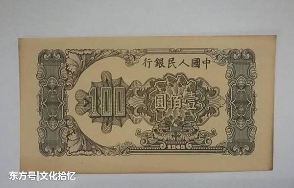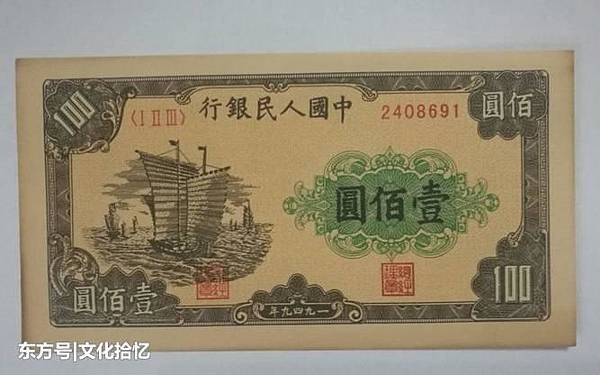 1949年100元人民幣大帆船以集合圖案組成,紙幣沒水印,圖案正下方會有"人"字暗記,並有紅藍纖維絲,是第*一套人民幣明星紙幣中的一員。