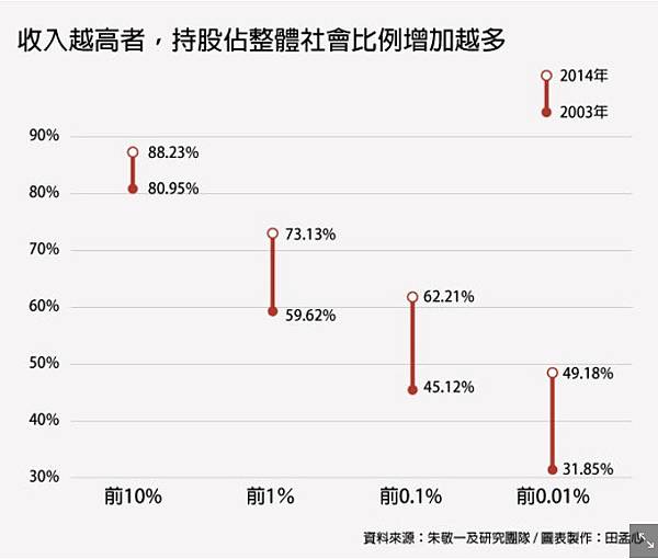 以股票為例,2003年時,社會上前十分之一的有錢人,持有整體社會總共80.95%的股票;經過十餘年,這個數字在2014年上升到88.23%。