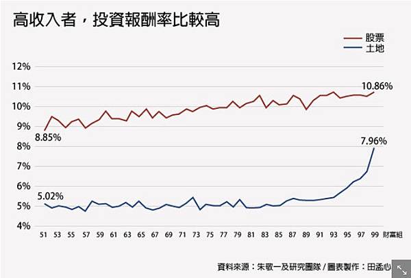 朱敬一還發現,有錢人不只可以靠土地賺錢,他們的投資報酬率也高於窮人。