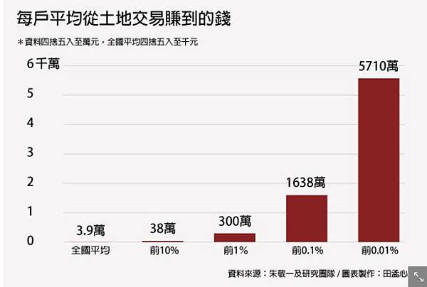 那這些有錢人,到底從土地交易中賺到多少錢?以2014年的資料來說,最有錢的萬分之一,每戶平均從土地交易賺到5710萬,而全國平均只有3.9萬(見下圖),兩者相差1464倍。