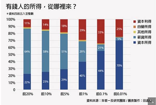 以圖中前0.01%的人(即社會上最有錢的萬分之一)為例,他們有四分之一的所得來自於土地增值所得,而薪資所得只有5%,印證了朱敬一所說,「靠薪水賺錢的都不夠有錢」。