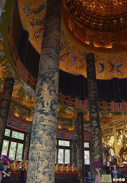 「一貫道祖師紀念館白陽聖廟」今天落成,屋內四根大柱子,以銅雕上梅蘭竹菊,象徵一年四季。(記者陳建志攝)