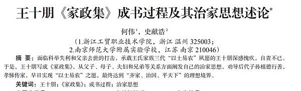 面臨科舉失利和父親去世的打擊,承載王氏家族三代"以士易農"夙願的王十朋深感愧疚,自責不已。 於是,王十朋寫成《家政集》,從父子、母子、夫婦和兄弟等關係方面闡發自己的治家思想,勸導後代子孫植德行善,孝悌傳家,早日實現"以士易農"之願,最終達到"齊家、治國、平天下"的理想境界