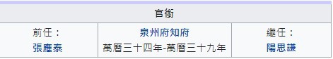 [1] 清道光《晉江縣誌》卷34"政績志. 文秩之一"。