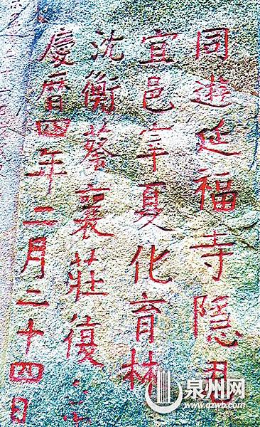 慶曆四年(1044年),蔡襄出知福州。同年,蔡襄應朋友之邀游賞南安豐州九日山,並於九日山建造寺(即延福寺)奉先院東壁留下題詩。據蔡襄親撰的《莆陽居士蔡公文集》載,蔡襄所題之詩名為《題建造寺奉先院》,全文為:「日照溪山生翠光,春深花草雜幽香。登臨誰會遲留意?門外塵埃去路長。」正因有蔡襄的這首題詩,故奉先院又被宋林少卿稱為「墨妙堂」。另外,九日山西峰東麓有摩崖石刻記稱:「慶曆四年二月二十四日,沈衡、蔡襄、莊復、□□□、邑宰夏化育、林□同游延福寺隱君亭。」沈衡當時是泉州通判,而夏化育時任南安縣令,他們陪蔡襄等人游九日山自在情理之中。延福寺北宋時為何會稱為建造寺呢?據《豐州鎮志》載,延福寺「建於西晉太康九年(288年),原址距九日山西去一公里許。唐大曆三年(768年)移建於九日山南麓今所,賜名建造寺。歐陽詹書題寺額,額今無存。宋乾德間(963年—968年),漳泉觀察使陳洪進增建,復舊名,並將五十四院落、五十餘支院,聯為一大禪林,使該寺進入全盛時期。」所以在北宋,是陳洪進為該寺恢復唐時寺名「建造寺」的。