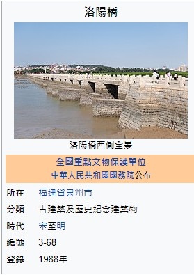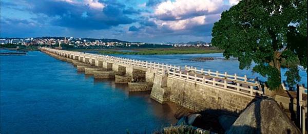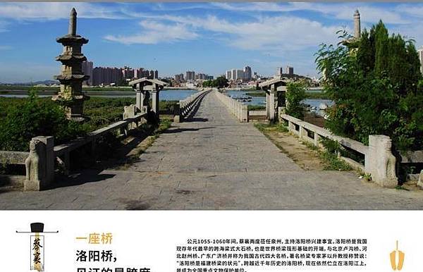 洛陽橋原名萬安橋,在福建省泉州市鯉城區洛陽鎮洛陽江上。由於洛陽江入海口過去稱為萬安渡口,所以當地人又稱洛陽橋為萬安橋。 洛陽橋是北宋泉州太守蔡襄倡建。北宋皇佑五年(1053年)開始動工,歷6年8個月竣工。橋建在江海交匯處,水闊浪急,工程非常艱巨。當時的勞動人民首創“筏型基礎”來建造橋墩,並發明了“殖蠣固基”。以固橋基。使往來行旅“去舟而徒,易危為安”。洛陽橋規模宏偉,原長1200米,闊5米許,橋墩46座,橋欄柱500根,石獅28隻,石亭7座,石塔5座。現存橋長834米、寬7米。殘存船形橋墩31座。 洛陽橋附屬文物很多,其中最引人注目的是橋南的“忠惠蔡公祠”內,蔡襄自撰親書的《萬安橋記》碑,此碑不僅書法端莊沉著,而且文字精煉,工刻細緻,譽為文、書、鐫“三絕”。 蔡襄不僅撰碑文,還親自揮毫題寫記文,成為《萬安橋記》碑的又一絕。