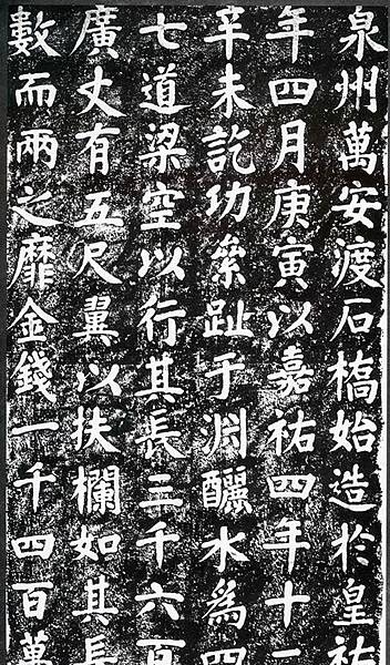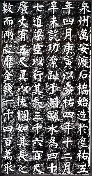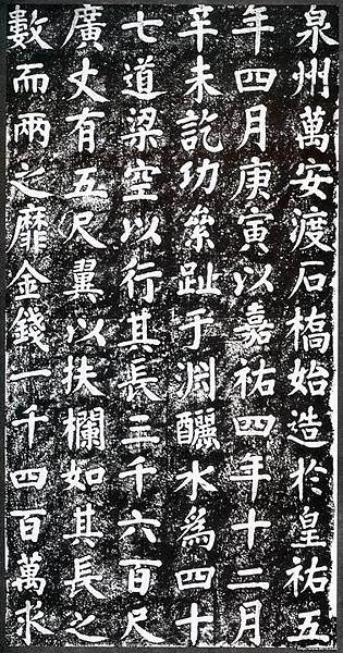 北宋蔡襄《萬安橋記》全文共153字,用楷體書寫,記載造橋的時間、年代、橋的長寬、花費的銀兩,參與的人物等,分刻在兩石碑上。又稱洛陽橋為萬安橋。