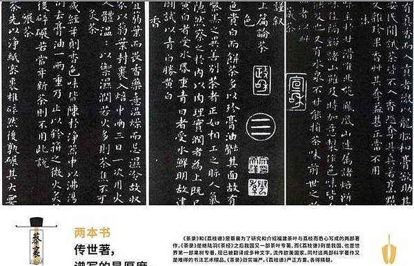 蔡襄最著名的書除了《荔枝譜》外,還有《茶錄》。這是繼陸羽《茶經》之後的又一部茶葉專著,它向世人介紹了茶葉品質、茶葉保存、品評方法,以及制茶工具、品茶器具等方面的知識。據仙遊蔡襄文化研究院顧問陳德鑄介紹,蔡襄在擔任福建路轉運使時,負責福建貢茶的監製。當時福建有官辦北苑御園在建甌鳳凰山一帶,蔡襄親自入山,朝夕與茶農、茶師相處,探詢茶樹栽培,茶葉採摘、焙制、烹煮等方面的技術,並發明了「小龍團」茶。這種研製精細的茶,在當時大大提高了福建茶業的知名度,並通過海外貿易遠銷世界各地。清代《廣群芳譜》引述幾種記載稱:「建州(治所在今建甌)有大小龍團,始於丁渭,成於蔡君謨。宋太平興國二年(977年)始造龍鳳團茶。咸平初,丁為福建漕(即轉運使)監造御茶,進龍鳳團。慶曆中,蔡襄為漕,始制小龍團。」