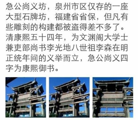 南少林最大的看點是山門前的牌坊,那個牌坊是現在泉州僅存的一個牌坊。 它矗立在工地上,幾乎都成了危險建築。 牌坊並不十分精美,但是閩南的牌坊很有特色,中間有很大的鏤空,然後牌坊的連接處也會使用青石,和整體的顏色形成反差。 "急公尚義---賜李森",故名:急公尚義坊。 清康熙五十四年(1715年),大學士李光地為旌表其八世祖李森,建立此坊。 "急公尚義"四字系康熙皇帝玄燁親筆。 坊為三重簷歇山頂樓閣式仿木石建築,立方柱12根,面寬三開間10.20米,三進深28平方米,高12米。 現保存基本完好,其石浮雕、透雕精美,是市區數百座石埤坊中的僅存者。 邂逅泉州,寻找一座古城的千年记忆 https://bit.ly/2Tb5Lx2