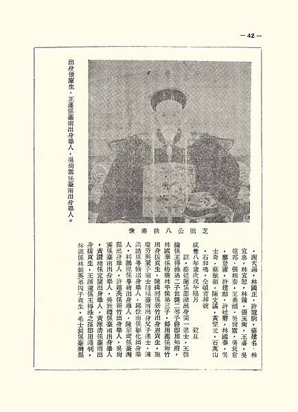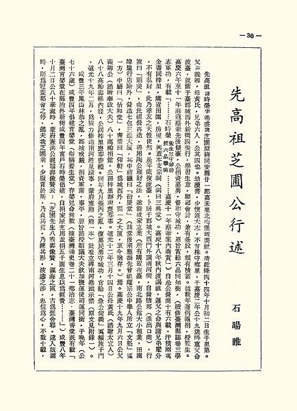 先高祖芝圃公行述 石暘睢 先高祖諱時榮字希盛號芝圃原籍同安縣廿一都嘉禾里北山堡坂美社。清乾隆四十四年十月初二日生于里第。父諱義卿,母黃氏,兄弟六人,公其四也。幼讀書,少懷遠大志,不甘株守鄉里,于嘉慶二年公十九歲時禀父命渡臺,就傭于臺郡城西外新街四美行,學習生意,繼司會計,兼有蔭股,頗有積蓄。越數年遵例報捐,授監生。嘉慶六年至十一年海寇蔡牽先後侵臺,公捐資募勇,督率守城功,恩旨賞給六品同知銜,(續修臺灣縣誌卷三學志軍功,有載「……石時榮監生以守城功授六品職銜……嘉慶十一年蔡牽案內奏賞」)。自是公營商十有六載,汗積兩萬金寄回梓里,購置田園,房屋,興蓋本支宗祠(祠曰三典堂)。嘉慶十八年秋內渡謁祖,遵父之命與諸兄弟鬮分,不有私財,此乃孝友之天性使然。是年底復渡臺,卜居于郡城大西門外頂南河街,自營糖郊(進出口商),行 號曰「鼎美」,由此經營再造,善用陶公理財之法,遂能成家立業(所有購置在臺,南北路公館大小租業,田園埤塭行店除外,營造七包三進大厦,其中前廳曰「衍慶堂」(該堂後來懸掛先曾祖耀宗公中舉人所立「文魁」匾一方)中廳曰「怡和堂」,書齋曰「仰軒」為城西外,獨一之大廈,至今猶存。)焉。嘉慶十九年九月六日公父義卿公(誥贈奉政大夫)八十高齡捐館,公歸梓里辦取喪葬事。道光十二年三月十四日公母黃氏(誥贈太宜人)八十八高齡壽終內寢,公回梓里喪葬盡禮。同年九月張丙之亂,復募民勇守城功,官給「急公尚義」匾額旌于門,道光十九年二月,為獨力修造南河港呈請事,蒙府憲熊(熊一本)批准立碑南河港頭示禁(原文見附錄一)。 咸豐三年鳳山林恭之亂,郡城戒嚴,捐資軍需,事平,恩旨誥授朝議大夫欽加鹽運使司運同銜,于晚年(公七十六歲)咸豐四平倡建育嬰堂(俗稱養生堂)存嬰兒命無數(據臺灣通史卷二十一鄉治志,臺灣善堂表有載「臺灣育嬰堂在縣治外新街咸豐四年富戶石時榮倡建,自捐家屋充用並捐五千圓生息以為經……」)咸豐八年十月二日公八十華誕時,蒙府憲洪公親題壽像賛云:「芝圃先生八袠壽像賛,瀛海之區,古為琵舍耶,逮入版圖時,則為冠盖都會之停,懿夫我芝圃翁,少服賈於斯,乃貞其質,乃練其形,波濤之涉,忠信為心,不數十載,占籍臺瀛,為朱公巨賈,雄踞而建瓴,乃翁則衰多盜寡,篤親戚,周卹鄉鄰,方今寇攘充斥,國帑重困,翁則義形於色,屢輸萬金於朝廷,是乃成家報國之徵應,宜永享乎遐齡,觴稱醉日陽春之二旬,大樁以八千歲為春,盈階桂馥與蘭磬,然則何以為翁頌,予曰吉羊亦壽考,宜孫子永康寧。愚弟洪毓琛題」進士蔡公廷蘭外八十三名人士等贈壽文八幅(原文見附錄二) 嗚呼榮矣!公元配莊氏(誥封宜人,卒于同治五年享壽八十三歲),副室黃氏(晋贈宜人)陳氏(例贈孺人)均先公率。三副室陳氏(例贈孺人,卒于同治十二年享壽七十歲)。公子八人,孫二十人,長耀端先公卒,孫朝法庠生,朝泮;朝深,次耀齡國學生先公卒,孫朝選,朝達;三耀昌邑庠生先公卒,孫朝津;四耀宗道光二十三年癸卯科舉人(筆者之先曾祖)先公卒,孫朝沃府佾生(筆者之先祖考),朝淨,朝湘,朝悅,朝意;五耀清國學生先公卒,孫朝典,朝誥;六耀祖優廪生在京授職刊部主政,孫朝來,朝聘庠生,朝麟庠生;七耀德優廪生先公卒,孫朝恩,朝賜,八耀星先公卒,孫朝英,朝安。公女三,長適黃諱肇昌,次三未詳。公卒于咸豐十一年二月十四日享壽八十有三歲,恩旨晋授通奉大夫,公生前仗義疎財,樂善好施行事前述畢矣,至於捐修廟宇。造橋路等等勒載本市各所碑記班班可考茲不贅述,謹誌公之行誼以供修志之採擇焉則幸甚矣。 四十三年二月十八日鼎美後人孝廉曾孫暘睢記于赤嵌樓下思無邪齋。 附錄: 、署福建臺灣府臺灣縣正堂裕,為獨力修造等事,本年貳月貳拾捌日蒙,本府憲熊,此據職員石時榮禀稱,榮住頂南河經商,歷年糖貨棧貯街內亭下,緣街外南河橋,原係衫木盖造,口口多年,行旅咨嗟不宜久廢,榮獨備資購買磚石,河底定基改造石橋,冀垂永遠,橋之東畔毗連涵口,夜間每有盜賊密涵入街偷竊,榮卽一併建用大杉木板舖密涵口,不特可弭盜賊,而且可杜填塞污穢,茲修完固,計費番銀口佰多元悉,榮獨力支理,查此橋涵城中遠近潦水,從此而出東接府第枋橋頭,南通上下橫街,北納關帝港,眾派溝流總歸口涵奔流入海,前因河底積糞,淋雨夜降,涵口擁塞水漲盈丈,城垣崩倒是其左證,因思此地雖將衫木盖密,眼前無患日久防疎,難免無堆積糞土之病,且杉木易朽,涵口何能仍通,欲得萬全此處,必須盖搭小屋遮蓋其上,不特可杜污穢,併為夜間街衢防守處所,庶亭下棧貯亦可無虞,此為思患預防,合函瀝禀,伏乞,仁憲大人恩准,行縣示禁,橋涵左右餘地,毋許仍前堆積糞穢,涵口盖密之處,准榮盖搭小屋以便防守,公私均有稗益,沾感切叩等情,蒙批據禀南河橋頹壞,經該職員獨力捐修,改用磚石,其橋東涵口用木密盖等情,均於地方有益,仰臺灣縣卽行出示嚴禁,居民人等毋許在橋涵左右堆積糞穢,仍准於涵口盖密之處,搭藔防守,幷着勒石永禁以垂久遠外,合行垂久遠等因,蒙此除遵照,憲批准該職員,在於橋涵蓋密之處搭盖藔屋防守,幷着勒石永禁以垂久遠外,合行出示嚴禁,為此示仰該處附近街衢居民人等知悉,自示之後,毋許在於橋涵左右餘地,堆積糞穢以資宣洩,而固城垣,倘敢故違不遵,一經察出,或被指禀,定卽差拏從嚴究辦,决不寬貸,各宜凛遵毋違特示,道光拾玖年參月 日,立石」(註民國前數