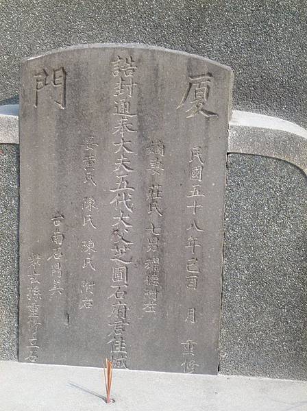 廈門 誥封通奉大夫五代大父芝圃石府君佳城 民國五十八年己酉月重修 台南石鼎美眾玄孫重修立石