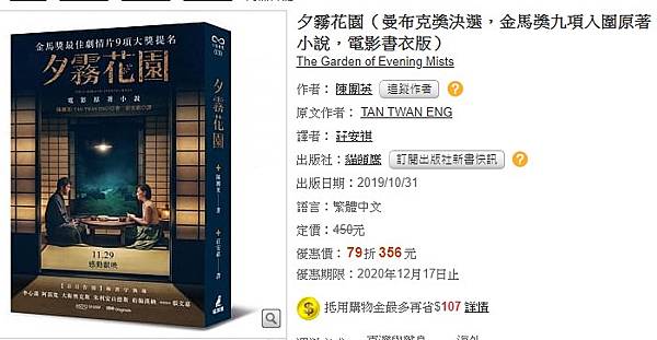 博客來-夕霧花園(曼布克獎決選,金馬獎九項入圍原著小說,電影書衣版) https://bit.ly/3obIFEu