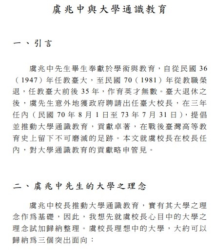 在國內的大學教育史上,大家耳熟能詳的是,虞先生擔任台大校長期間,執著推動「通才教育」,不在乎當局的顧忌,真是雖千萬人吾往矣!今日,「通才教育」或「通識教育」已成為國內大學生人格養成與專業訓練的重要一環,我們能不感念這位「通識教育」前輩當年的堅持 ﹖