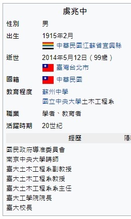 曾任台大土木系主任、台大工學院院長、台灣大學校長的虞兆中教授,於2014年5月12日辭世,享嵩壽100歲整。