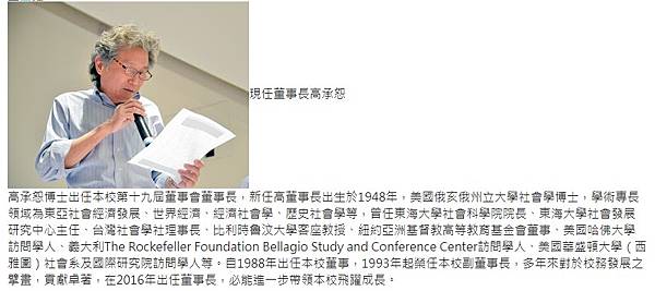高承恕博士出任本校第十九屆董事會董事長,新任高董事長出生於1948年,美國俄亥俄州立大學社會學博士,學術專長領域為東亞社會經濟發展、世界經濟、經濟社會學、歷史社會學等,曾任東海大學社會科學院院長、東海大學社會發展研究中心主任、台灣社會學社理事長、比利時魯汶大學客座教授、紐約亞洲基督教高等教育基金會董事、美國哈佛大學訪問學人、義大利The Rockefeller Foundation Bellagio Study and Conference Center訪問學人、美國華盛頓大學(西雅圖)社會系及國際研究院訪問學人等。自1988年出任本校董事,1993年起榮任本校副董事長,多年來對於校務發展之擘畫,貢獻卓著,在2016年出任董事長,必能進一步帶領本校飛躍成長。逢甲大學-秘書處全球資訊網-高承恕-現任董事長高承恕 https://bit.ly/3kp296o