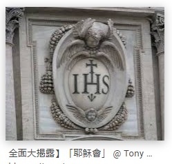 中間有耶穌釘在十字架上的塑像,上面有耶穌會標誌 IHS