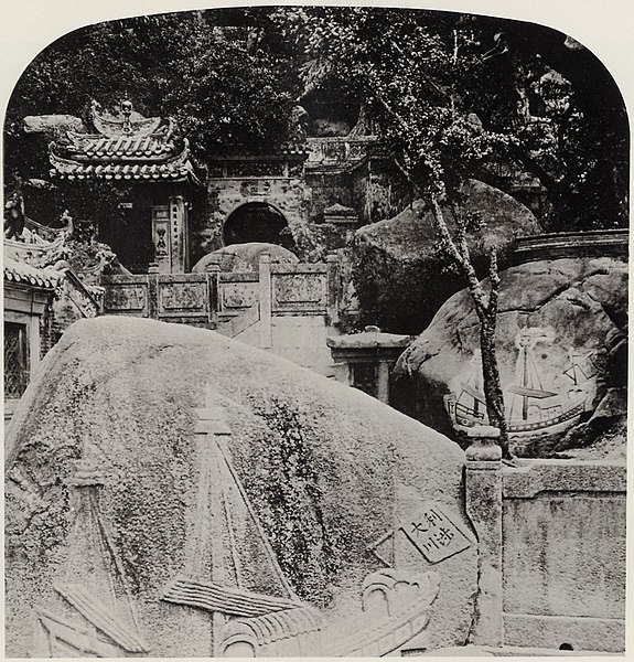 “ 「相傳明萬曆時,閩賈巨舶被颶殆甚,俄見神女立於山側,一舟遂安,立廟祠天妃,名其地曰娘媽角。娘媽者,閩語天妃也。於廟前石上鐫舟形及『利涉大川』四字,以昭神異。」 ”