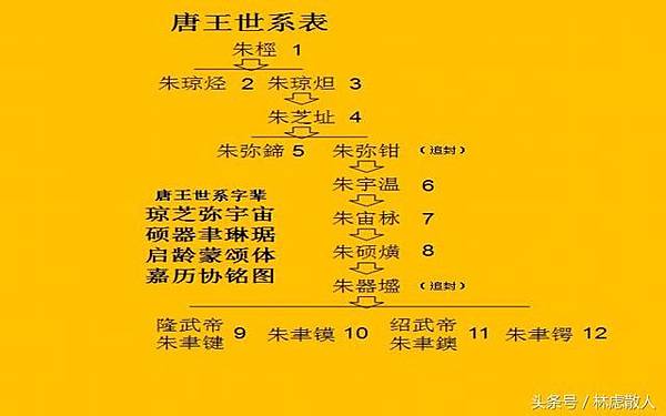 隆武帝是明太祖的九世孫。他在福州時。自叙其略歷云:「朕始祖唐定王,高
