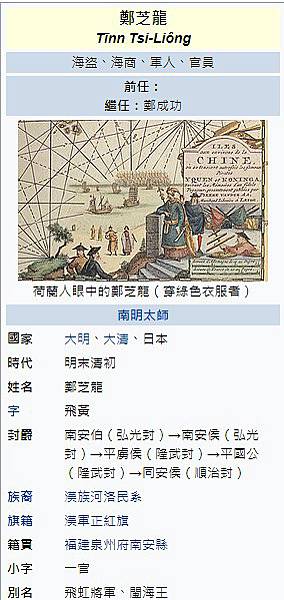鄭芝龍,福建泉州南安人,明末清初最大的海商兼軍事集團首領,鄭成功的父親,台灣鄭氏王朝的開創者。發跡於日本平戶,因命令部下「禁侵略,放還所獲軍將。每戰勝,追奔,輒止兵」,這種方式讓他成為明朝官府的招撫對象,其實最主要的是明政府無力剿滅鄭芝龍,所以才將他招安,命其為福建總兵。