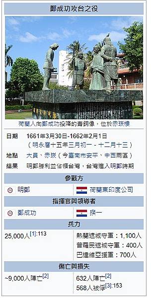 因此,即使投入壓倒性的兵力,又有何斌的軍事情報,加上他殘留在荷營的黨羽做為內應,才敢放膽一搏,這是他謹慎精明之處 ,上海灘地痞出身的蔣介石,在軍事方面顯然遠遜於闖蕩大風大浪的鄭成功,當然這和他成長背景和「靠爸族」的庇佑也有關係;原本其父鄭芝龍最初職業就是擔任荷蘭人與明朝官家貿易的通譯,後來日本幕府鎖國政策只允許和荷蘭貿易,藉機混水摸魚私下大做日本與海外貿易的獨門生意,因此賺了日後促成他發跡的人生第一桶金 ,有了父親的承傳,鄭成功自然摸透了這些替洋人當通譯的漢人心態,只要有打著民族主義就能把「背叛」的罪行合理化,再施以利誘自然無堅不摧,台灣百年來的政壇風雲是這場民族大戲的最佳舞台,所以開戰之前,鄭軍事先已經取得安平 潮汐等海象資料和荷蘭軍隊部署詳情,同時又利用掌控台灣近海控制權的優勢,全力圍堵駐台的荷蘭政府對外的貿易,最後等時機一到,趁著台海風平浪靜,非常不利設在印尼雅加達的荷蘭東印度公司總部帆船戰艦馳援的 ,三月初鄭成功誓師自金門 料羅灣 出發,次月抵澎湖 ,四月初二日抵鹿耳門。並利用夜間漲潮,加上城內有內應搖燈號引導艦隊順利進入台江內海,出其不意在鹿耳門及禾寮港(台南市開元寺 附近)登陸,迅速以優勢兵力包圍荷軍防守薄弱的普羅民遮城(台南赤崁樓 ),並切斷荷軍水陸交通,普羅民遮城守將「貓難實叮」被迫獻城投降,鄭成功把這些情報戰和間諜的成果,全都歸功於媽祖顯靈,諷刺的是,數年後,媽祖再次顯靈,卻是引領他自己的叛將來消滅他的王國,據說施琅從澎湖 往台灣接受鄭克塽的降書時,一路都有一名白衣女子在海上引路,否則當地海域暗礁密佈不可能如此順利,據說,施琅上岸時看見廟宇就入內參拜,見眼前素衣的媽祖裙襬盡濕,才恍然大悟一切都是天意安排,這種媽祖顯靈戲碼的鬼畫連篇,屢次被統治者反覆操弄,成為島上的主要信仰,只是媽祖身價每下愈況,從海賊統領、水師將領遮羞的人形立牌,如今淪落成為地痞流氓和貪婪的政客的禁臠,只要信徒一日不散場,就會有地痞政客美其名為宗教信仰,繼續利用這尊框金又包銀的神像唬爛。