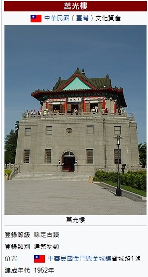 莒光樓位於金門縣金城鎮,是一幢仿古宮殿式的三層樓建築,建於民國41年(西元1952年)用以表彰在金門歷次戰役中英勇官兵之事蹟。