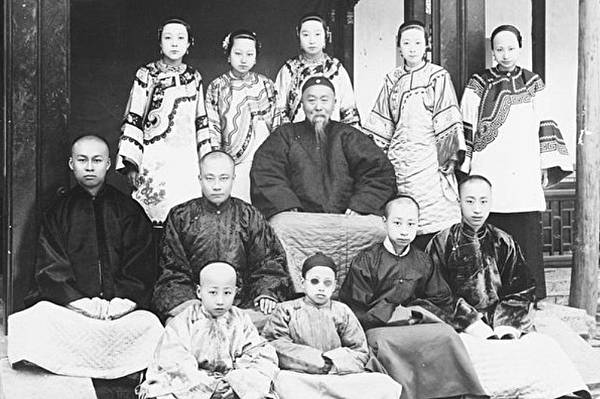 李鴻章與兒孫輩合照,李鴻章正後方女子為李菊耦。(公有領域)