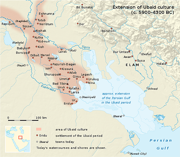 美索不達米亞地區基本由沙漠、山巒和大海環繞而成;其西邊是敘利亞沙漠,北部是土耳其的托羅斯山脈,東部是伊朗的扎格羅斯山脈,南邊濱臨波斯灣[10]。幼發拉底河和底格里斯河發源於土耳其東部的山脈和高地,隨後幾乎平行地向南流入波斯灣,沿兩岸形成的沖積平原就是美索不達米亞。以今天的巴格達為界,可將美索不達米亞分為南北兩部分,即北部的亞述和南部的巴比倫尼亞[11]。劃為亞述的北部地形為高地,自然資源和降雨相對豐富,以這裡為中心,在前1600年產生名為亞述的軍事帝國[12];而劃為南方的巴比倫尼亞地形為低地,缺乏石頭、木材、金屬之類的材料,此地年降雨量不足200毫米,當地人們使用灌溉進行農業生產,豐收的農產品使城市得以發展,此地區於前3500年左右,產生蘇美文明:包括初期的烏魯克城市文明、蘇美早王朝時期和阿卡德帝國;前2000年左右,蘇美文明一度衰落[13][14],不過南方後來興起的巴比倫繼承蘇美的文明,並成為該地區的中心城市。追溯蘇美之前的人類文明時,可以看到前第7千紀至前6千紀的遺址:美索不達米亞北部的哈蘇納、中部的薩邁拉、稍晚的北方哈拉夫、及更晚的南部歐貝德[15]。歐貝德位於公元前第4千紀和公元前第3千紀的濱海地區,後來該地區變為陸地,幼發拉底河和底格里斯河也逐漸匯聚在一起,成為今天的阿拉伯河後流入波斯灣[16]。美索不達米亞 - 維基百科,自由的百科全書 https://bit.ly/3261iAi