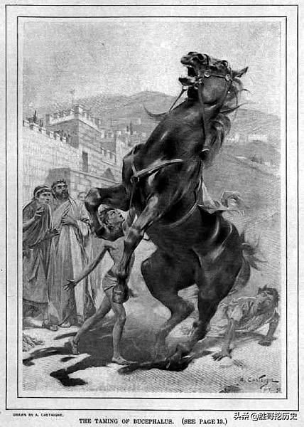於是,他向父親打賭他能馴服這匹烈馬。亞歷山大將黑馬趕到朝向太陽的方向,這樣,馬的影子正好在後面,隨即亞歷山大爬上馬鞍,騎著黑馬跑了一圈。見此情景,腓力高興地說:"孩子,你一定會建立一個更大的王國實現自己的抱負,馬其頓對你而言太小了。"後來,黑馬成了亞歷山大忠誠的坐騎,伴他征戰四方,直到在今天的巴基斯坦與印度"象兵"作戰時戰死。