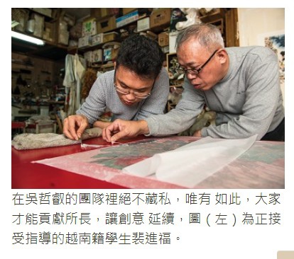 「我在學裱褙的路上,走了很多冤枉路,也遇到很多不好的老師。」吳哲叡教徒弟的理念很特別,在他的團隊裡絕不會藏私,因為唯有這樣,大家才能貢獻出自己所研發出的成果,也才會有源源不絕的創意與動力,而他的責任就在於引導出每位學員的獨特性與潛能。