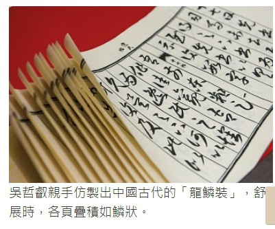 吳哲叡親手仿製出中國古代的「龍鱗裝」,舒展時,各頁疊積如鱗狀。