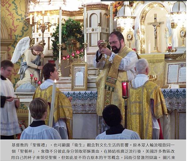 基督教的「聖餐禮」,也可顯露「衛生」觀念對文化生活的影響。原本眾人輪流啜飲同一個「聖餐杯」,象徵不分彼此身分領取耶穌寶血,在肺結核廣泛流行後,美國許多教區改用自己的杯子來領受聖餐,但如此並不符合原本的平等概念,因而引發激烈辯論