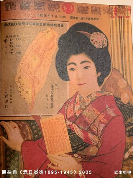 女子端坐沙發,手持印有民國七年的農民曆;背景是一張臺糖廣佈全台的原料甘蔗採收區域圖,多數集中在西南部;中左詳列製糖牌號;右下可見總行地點在打狗(時台灣第一座現代化的橋仔頭製糖所就座落高雄);左下則明白揭露三井洋行當時包辦銷售,除了臺灣,應當還有中國通路(包售中華各?)。俗話說「三個保正八十斤」或「第一憨,種甘蔗乎會社磅」...諸多反映殖民統治、榨取民膏民脂的現實,這點從廣告上緣💲與套上厚重有如城牆一圈的圖示(時臺糖logo?)來看,也能推敲一二