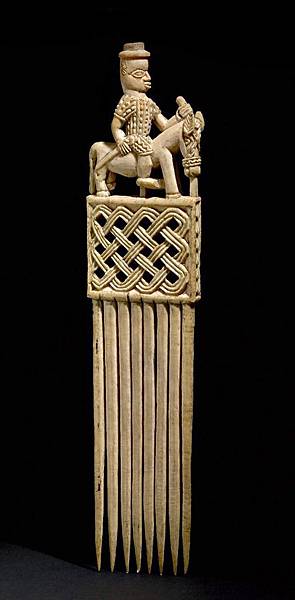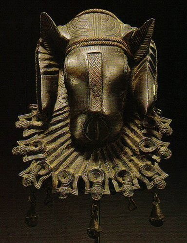 圖為貝南青銅飾板《將軍與士兵》,嚴格遵循對稱原則來構圖,其變化因素在於裝飾紋樣的區別。 雕塑的主體部分採用近於高浮雕的手法,突出了所要強調的中心人物。 飾板上用點、線、面相結合的手法處理的細部裝飾,將青銅鑄造的精緻性予以充分的發揮,其精美程度令人歎為觀止。