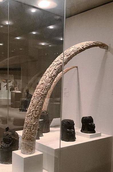 小一点的象牙雕刻是为了纪念19世纪的贝宁国王阿杜罗(Adolo, 1850-1888年在位),雕刻中间的人物是贝宁王国最伟大的国王之一——征服者奥祖鲁(Ozolua the Conqueror),他的统治时间在15世纪。