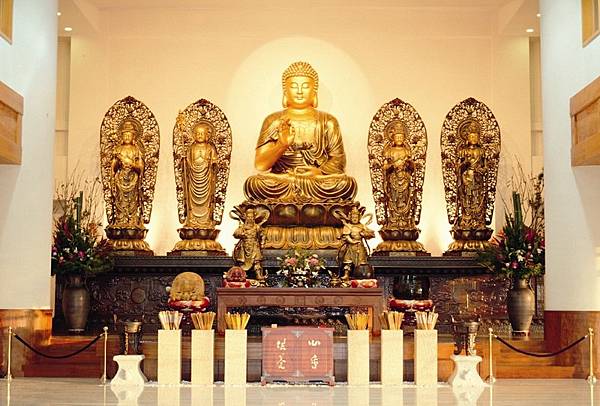 緣道觀音廟一樓參拜大廳供奉 大自在王佛暨觀音、文殊、地藏、普賢四大菩薩。