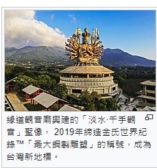 緣道觀音廟興建的「淡水‧千手觀音」聖像, 2019年締造金氏世界紀錄™「最大鋼製雕塑」的稱號,成為台灣新地標。