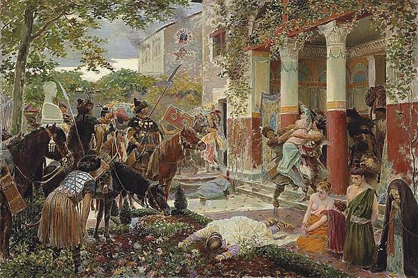 羅什格羅斯1910的作品《匈人》中所描繪的阿提拉帶領其士兵洗劫高盧的情景