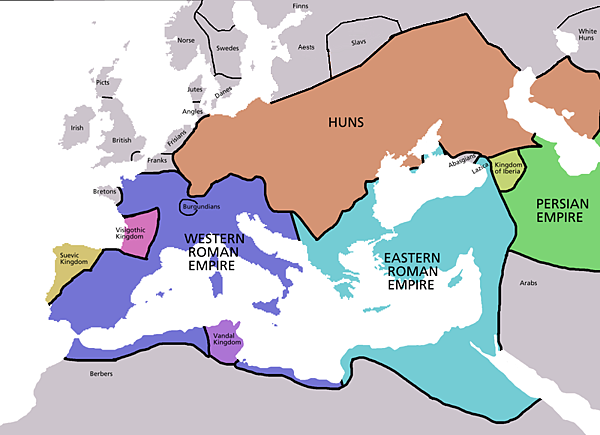 公元395年,羅馬帝國分裂為東羅馬帝國和西羅馬帝國,公元410年,日耳曼西哥特王國與匈人的聯軍攻破了幾百年來堅不可摧的羅馬城,羅馬遭受毀滅性打擊。公元432年,匈人各部落完成了統一。443年,匈人攻到東羅馬首都君士坦丁堡城外,東羅馬軍團全軍覆沒,但由於匈人欠缺攻城武器,所以面對著君士坦丁堡的巨大城牆只能圍困該城,之後東羅馬帝國與匈人訂立和約。公元445年,匈人的副王阿提拉殺掉與其聯合執政的兄弟大王布萊達,成為了匈人唯一的王。在阿提拉的領導下,匈人帝國的版圖達到極盛,東西羅馬帝國都聞之心顫,連所謂當時的蠻族日耳曼人也聞之膽寒,匈人可謂蠻族中蠻族,歐洲人稱阿提拉為上帝之鞭。公元453年,阿提拉去世,其兒子們爭奪王位,他們的帝國很快土崩瓦解,整個民族也消失在了歐洲的歷史中。