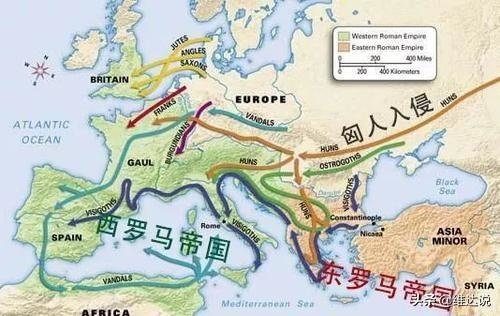 這個從亞洲大草原不知道哪個角落冒出的匈人,消滅阿蘭國後,在歐洲的頓河流域逗留了幾年後,在公元374到375年一年之間就消滅了日耳曼人剛剛建立起的疆域遼闊的東哥特王國,隨後又對日耳曼的西哥特人一頓痛揍。公元378年,在阿德里雅堡匈人大敗羅馬皇帝瓦倫斯,在匈人的驅趕下,日耳曼等民族開始了更大規模的往羅馬帝國境內的民族大遷徙。