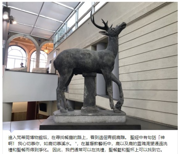 進入梵蒂岡博物館后,在尋找餐廳的路上,看到這個青銅鹿雕。 聖經中有句話「神啊! 我心切慕你,如鹿切慕溪水。 ",在基督教藝術中,鹿以及鹿的靈魂渴望通過洗禮和聖餐而得到淨化。 因此,我們通常可以在洗禮,聖餐籃和聖杯上可以找到它。