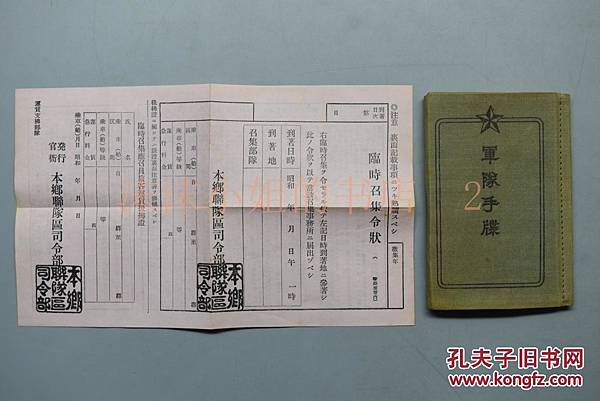 日军《军队手牒》1册 附临时召集令状一张 本乡联队司令部发行 大正元年三年明治十五年昭和元年勅谕 军队手牒应招及出征时心得等 日本右翼势力战后初版发行妄图复兴法西斯日本军国主义 1970年