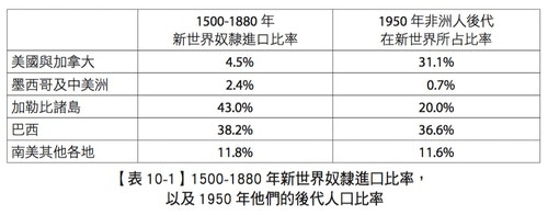 叫人吃驚的是只有約四十萬人(約 四・五%)前往英屬北美洲殖民地。表10-1依據目的地及一九五○年他們後代的地域分布,彙整出奴隸抵達新世界的比率,才解開謎團。首先,請注意這個事實:美國及加拿大雖只收受不到二十分之一的奴隸,但今天這兩國擁有近三分之一的黑奴後代。相反的形 態則出現在加勒比地區,來到此地的奴隸達五分之二以上,但今日其後代的比例只占五分之一,意味著那些島上,要維持奴工人數很困難。