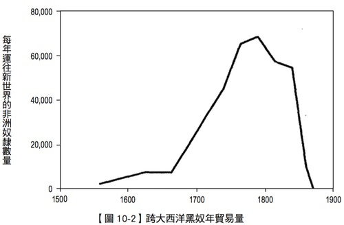 他們數據勾畫的光景令人震驚。從一五一九年到一八六○年代末期奴隸貿易結束之前,有九百五十萬非洲奴隸抵達新世界。圖10-2勾勒每年跨大西洋的奴隸交易量。鑒於中轉航程中,死亡率的最佳估計值約為一五%,這意味著當初由非洲啟航的俘虜達一千一百萬人。