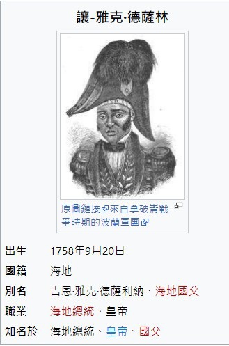 弗朗索瓦-多米尼克·杜桑·盧維杜爾(1743年3月20日—1803年4月7日),拉丁美洲獨立運動早期領袖,拉丁美洲獨立運動偉大的革命家、軍事家,海地共和國締造者之一、國父。生於海地北部海地角附近的黑人奴隸家庭,受過一定教育,讀過法國啟蒙主義哲學著作和古代歐洲軍事家著作。1802年,領導海地軍民抗擊拿破崙·波拿巴派來的遠征軍,後因軍事失利被迫議和。6月7日,與法軍會談時,因上當受騙被法軍逮捕,後被押送法國,1803年4月7日病逝於獄中,享年60歲。