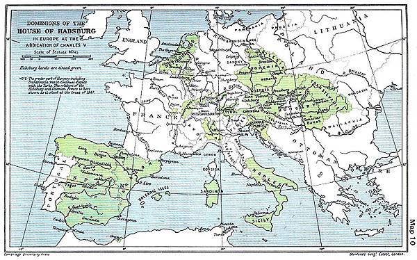 1516年,查理五世繼承西班牙(卡斯蒂利亞和阿拉貢)王位,是為卡洛斯一世,在1556年卡洛斯一世退位,將西班牙王位讓與其子菲利浦二世,並廢除了菲利浦及其後裔繼承神聖羅馬帝國皇帝的權利,正式揭開了西班牙哈布斯堡家族統治的序頁。此後在哈布斯堡國王的統治下,西班牙進入了黃金時代,成為世界第一個「日不落帝國」。