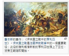 魯本斯的畫作:《伊夫里之戰中的亨利四世》。伊夫里之戰是法國宗教戰爭中的一個重要戰役;此役的勝利將信新教的亨利四世推上了王位,波旁王朝隨即開始。