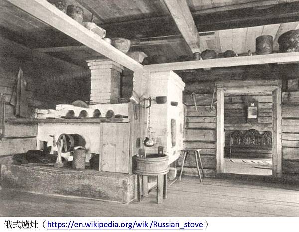 第二個決定飲食的條件為住房,居住空間很有可能養成烹調方式。華人烹煮學問淵博,有煎煮炒炸蒸燜滷熬烤燉煨燴煸爆…廚房因此給人印象總是油膩膩。俄國人廚藝不求艱深繁複,即出於舊式無隔間的居住空間。今日俄國鄉間仍可見許多小木屋(dacha),類似過去民間的住房。農村裡面積不大的一層或兩層小屋(izba)裡含臥廳廚,還可養家禽牲口,非常充分利用空間。小屋裡有個大爐灶,外型類似歐美壁爐或窯烤餐廳的烤爐,是全家人生活重心,不僅肩負煮食,爐灶上方平台在冬天還充做睡覺用的床,相當於中國華北地區的「炕」,很聰明的設計。因應這種爐灶,幾乎只用烤和煮的方式料理食物,再以火候大小做變化。例如俄國以湯品為餐食招牌,就是燒煮而成;其他食材,穀物、蔬菜或魚肉類可燜煮、燉煮或熬煮方式烹調,這些都保留於現今俄國家常菜。此外,俄國家庭缺不了烤箱,除了烤熟一般餐食,各種烘焙的包餡麵包、派餅等「麵食」也很常見,都是從小屋的「爐灶」流傳下來。